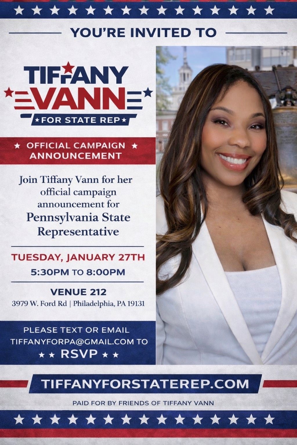 Venue 212 3979 W. Ford Rd, PhiladelphiaJoin Tiffany Vann for her official campaign announcement for Pennsylvania State Representative.